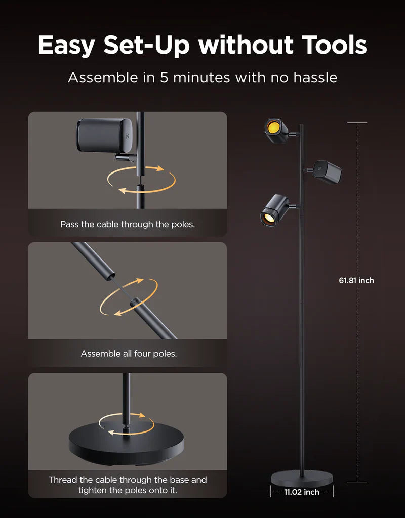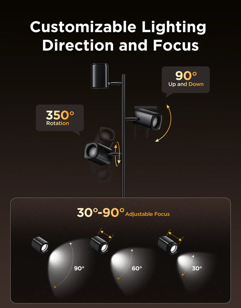 Discover Govee Tree Floor Lamp, featuring flexible triple-lamp control for customized on/off, brightness, and color effects. With lamp arms that rotate 350° horizontally and 90° vertically, plus adjustable lamp heads, you can achieve precise lighting.
